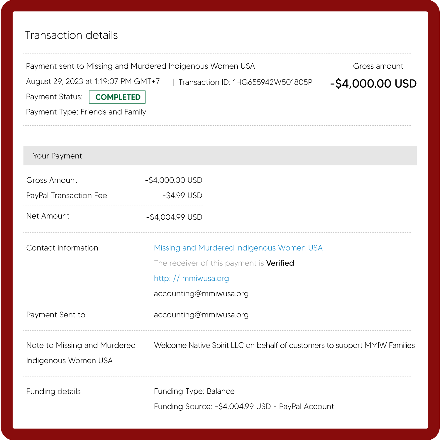 With your support and the collective effort of our customers, we are pleased to announce that we have donated $4000 to MMIW USA through mmiwusa.org. This organization empowers the Indigenous community and provides essential resources and support.