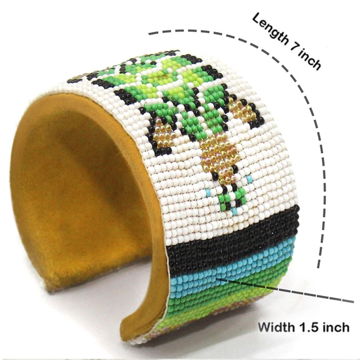 Free Size Bracelet, 3.0 Inch Diameter, Length Of Beaded Part Is 7.0 Inch, Back Part Of Bracelet Covered With Natural Soft Pu Leather. The picture may have a different shade of leather but you will receive the natural tan color leather in the bracelet.
