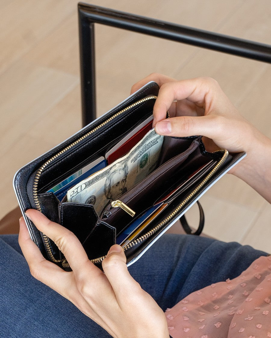 • Roomy interior features eight card slots, one zipper pocket, one phone pocket, and two full-length pockets