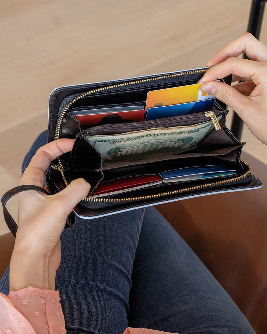 • Roomy interior features eight card slots, one zipper pocket, one phone pocket, and two full-length pockets