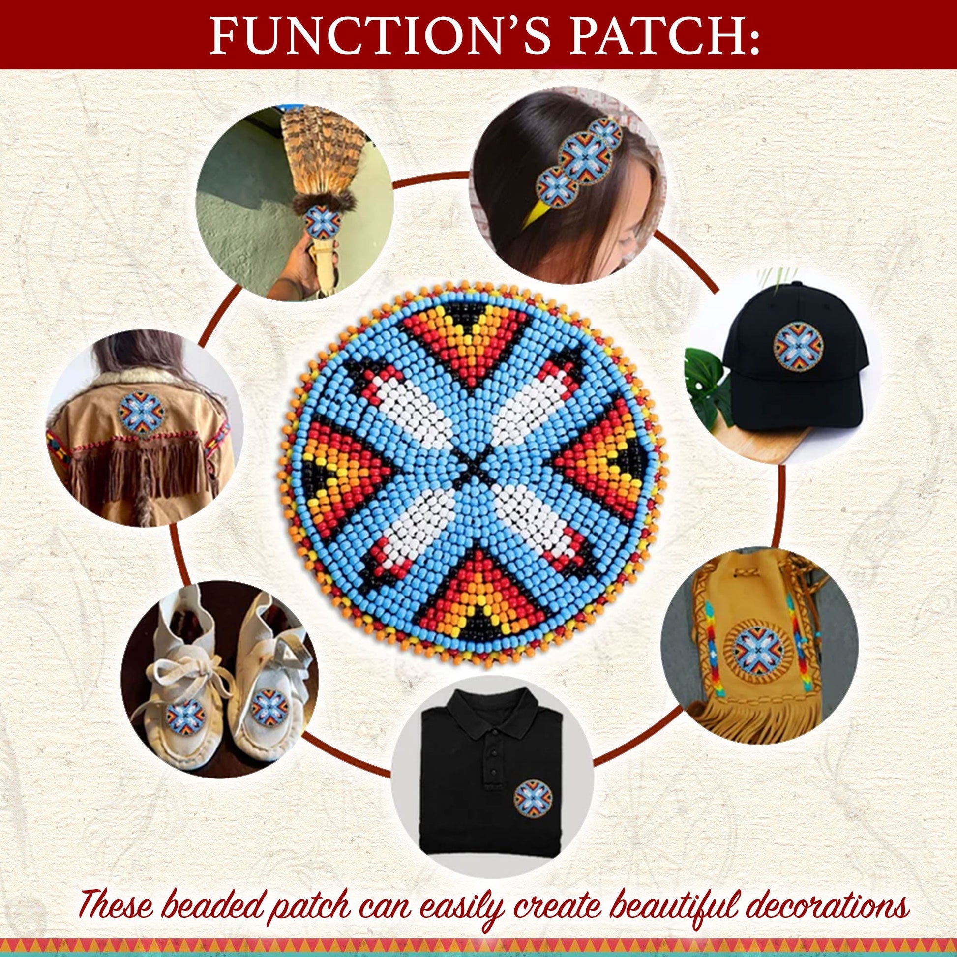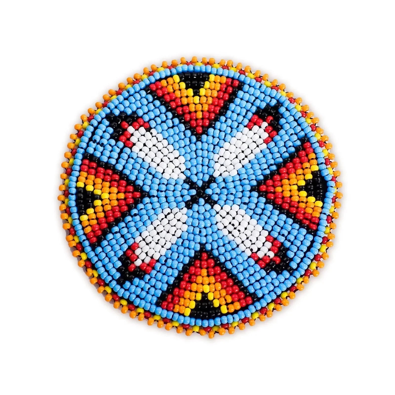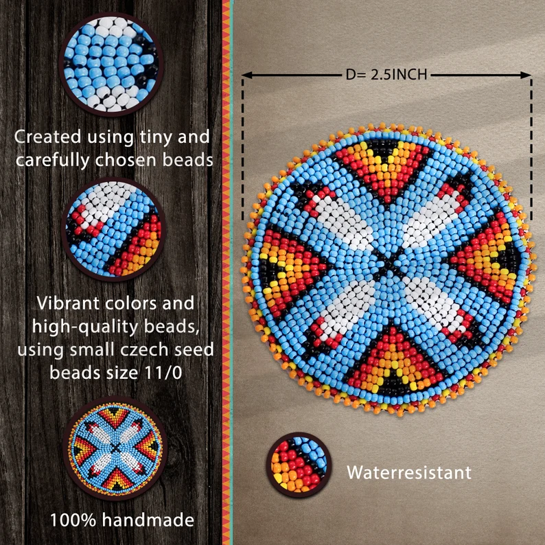 This beaded patch, inspired by Native American design motifs, showcases a harmonious blend of vibrant colors and intricate patterns. The rich tones and bold primary hues pay homage to the natural landscapes that have shaped the lives and spirituality of indigenous communities.