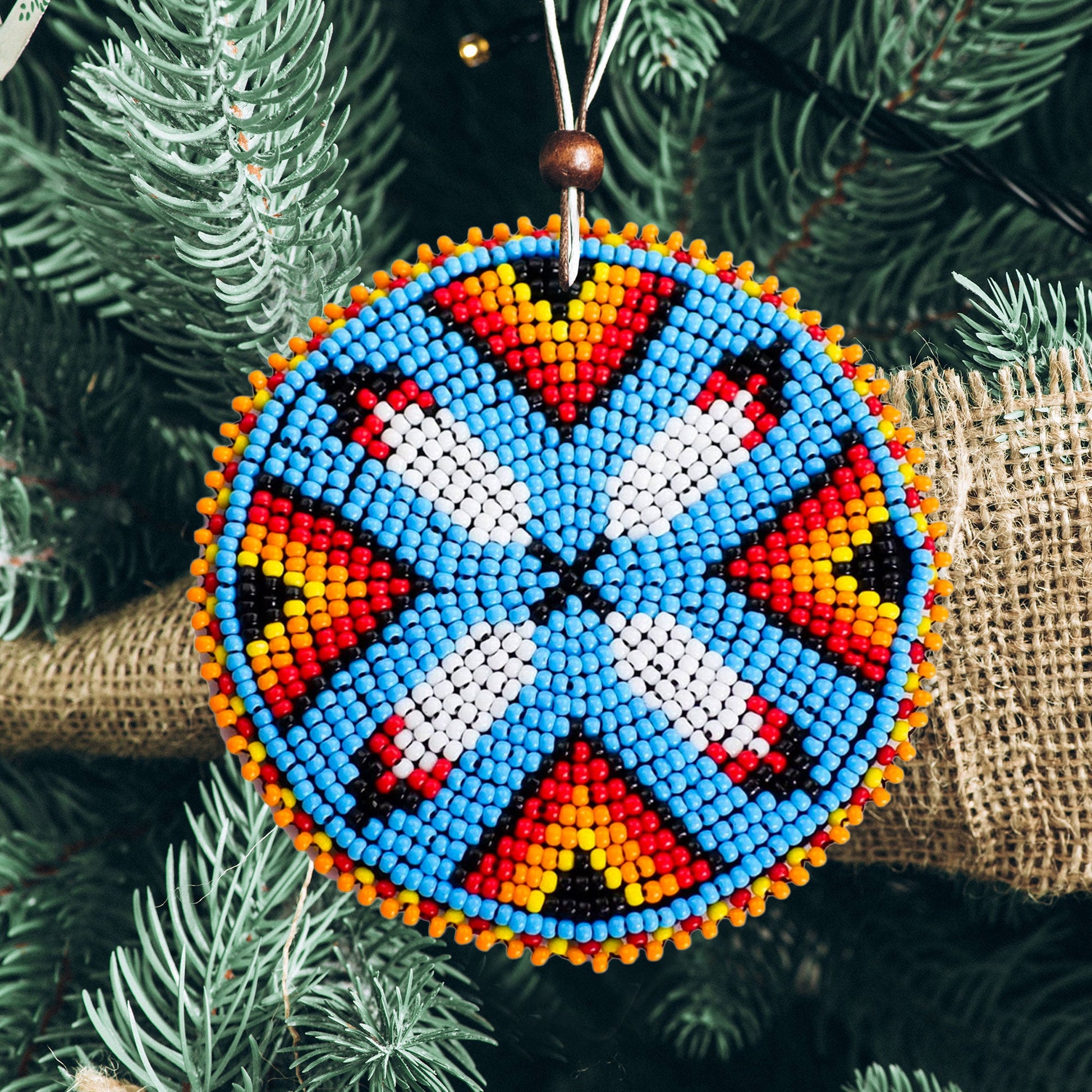 The beads, carefully chosen for their brilliance and symbolism, are meticulously hand-stitched to form an intricate geometric pattern that holds deep spiritual significance.