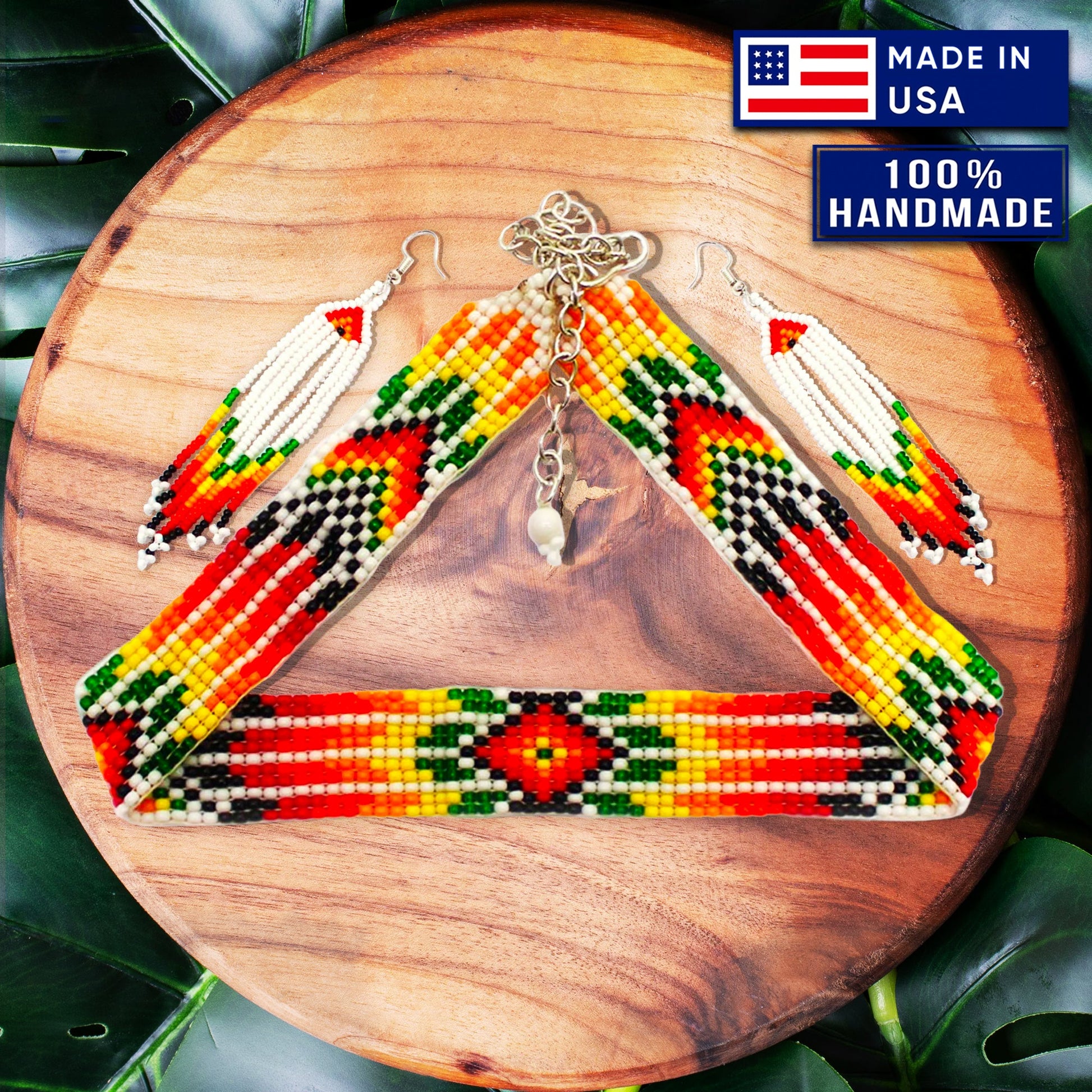 The necklace in a beaded Native American pattern Jewelry Set can come in different styles, such as a choker or a longer pendant necklace, and typically features a pendant that is also adorned with beads in a traditional Native American pattern.