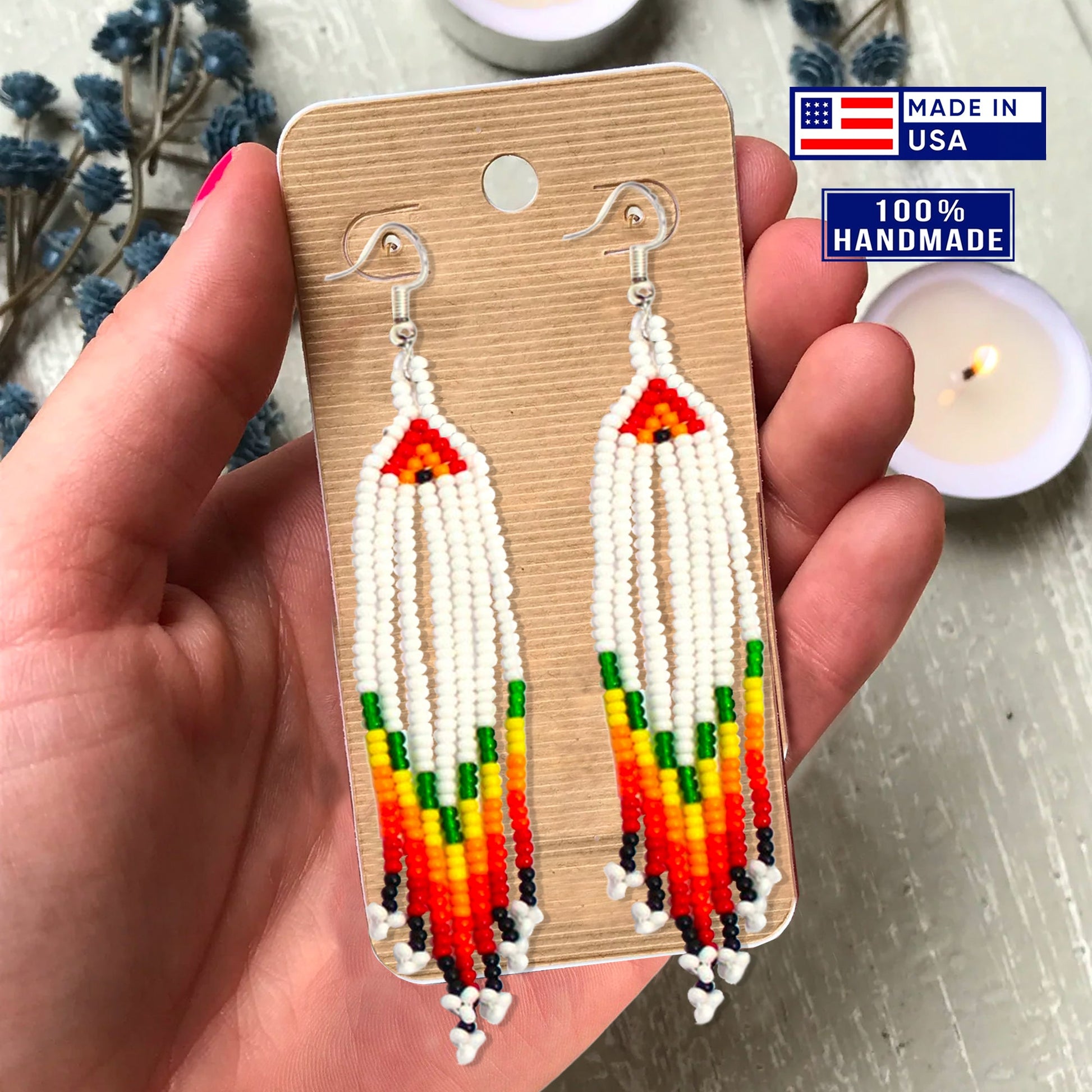 The earrings in a beaded Native American pattern Jewelry Set typically dangle from the earlobe and may feature a hook, stud, or clip-on attachment. They often showcase geometric shapes and bold colors that are characteristic of Native American beadwork.