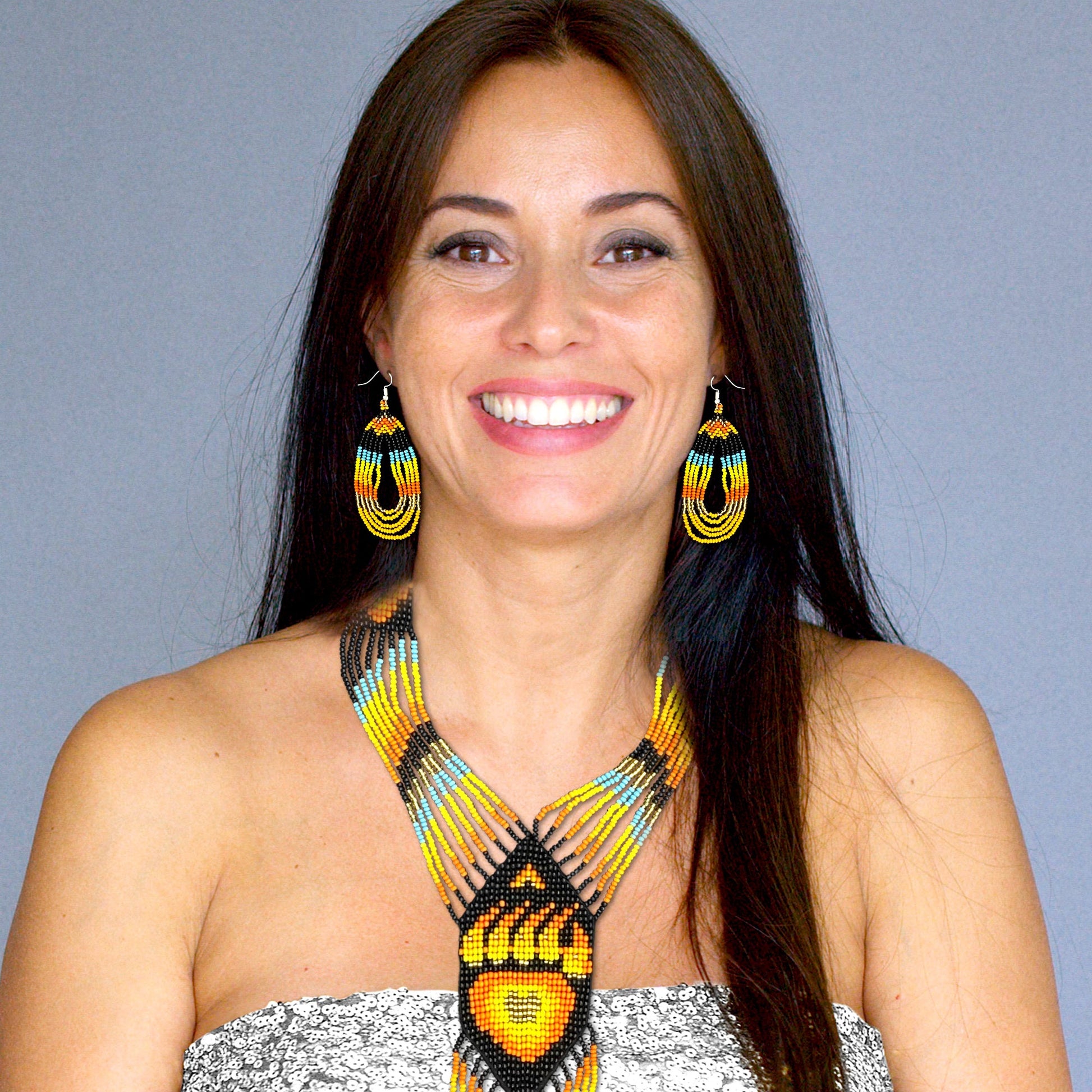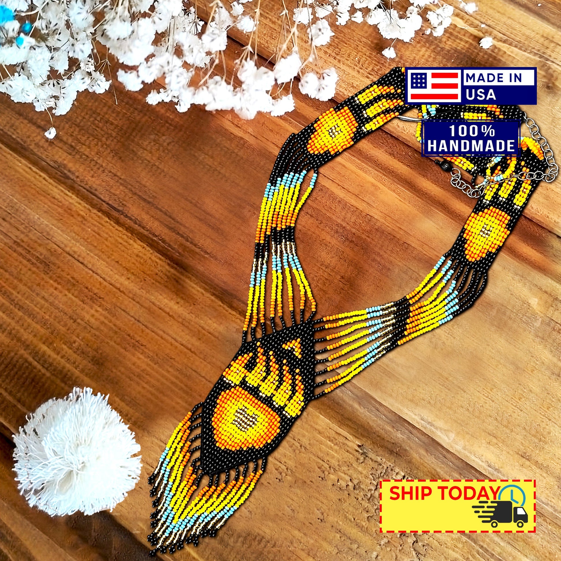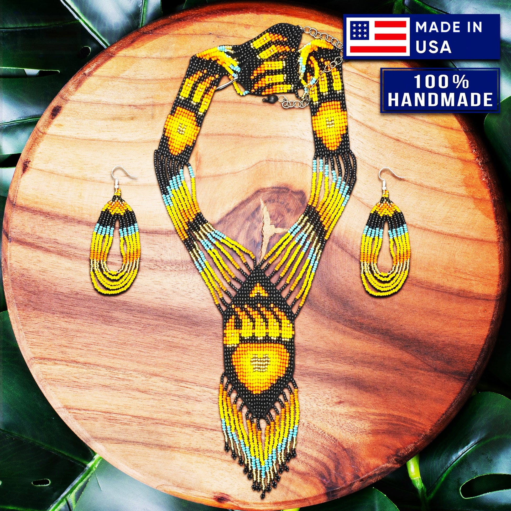 The necklace in a beaded Native American pattern Jewelry Set can come in different styles, such as a choker or a longer pendant necklace, and typically features a pendant that is also adorned with beads in a traditional Native American pattern.