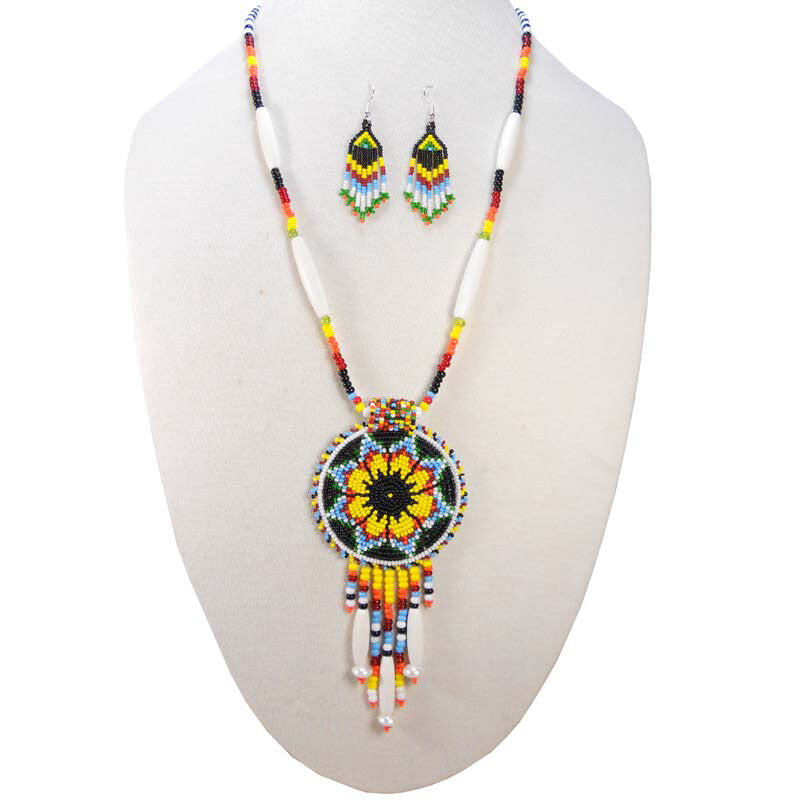 Black Yellow Seed Bead Long Star Medallion Handmade Necklace Earrings Set WCS
